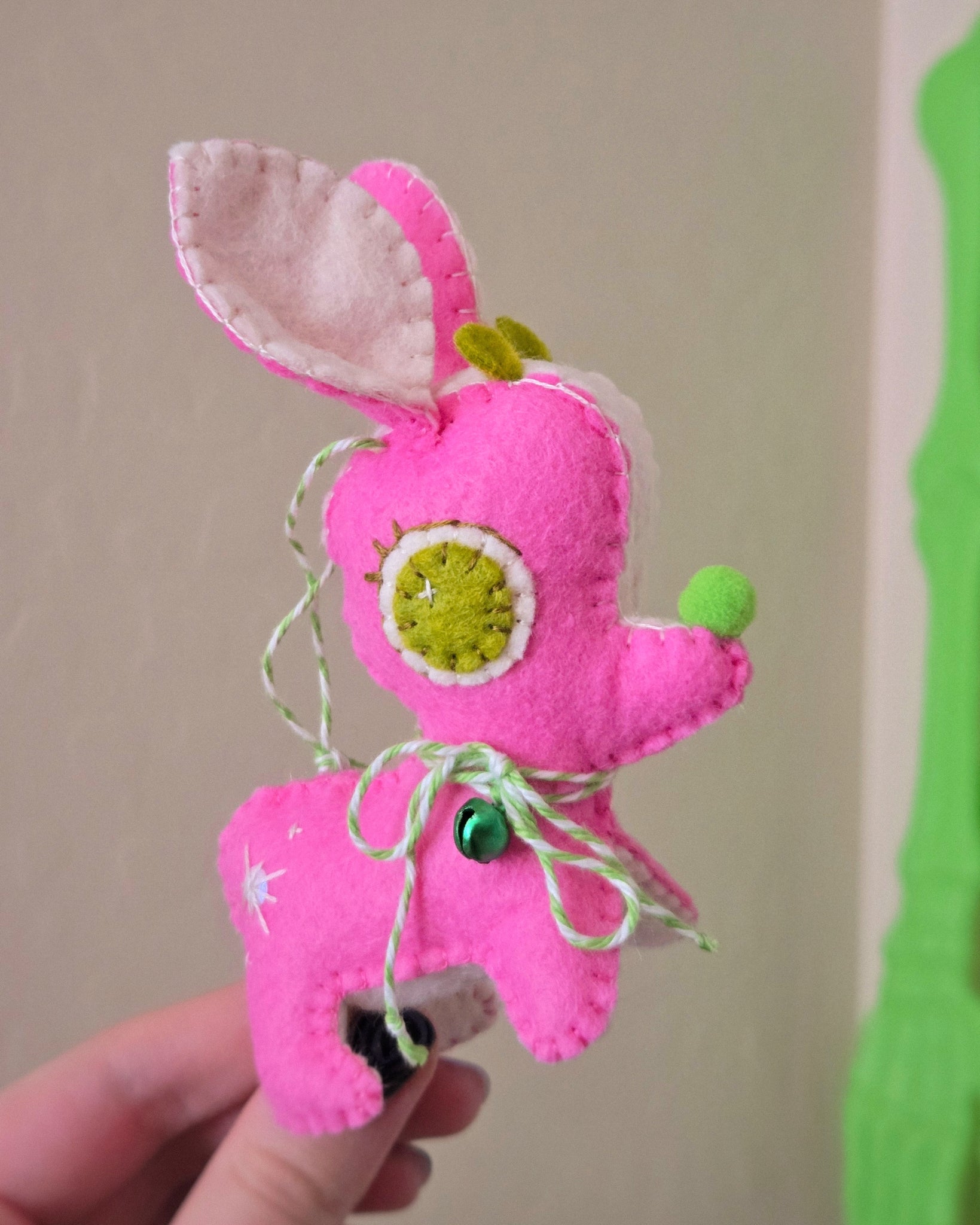 Cute deer ornament. Completely hand sewn with high quality felt. Each one has a bow and jingle bell tied around it's neck and a string on top to hang in a tree or wherever!