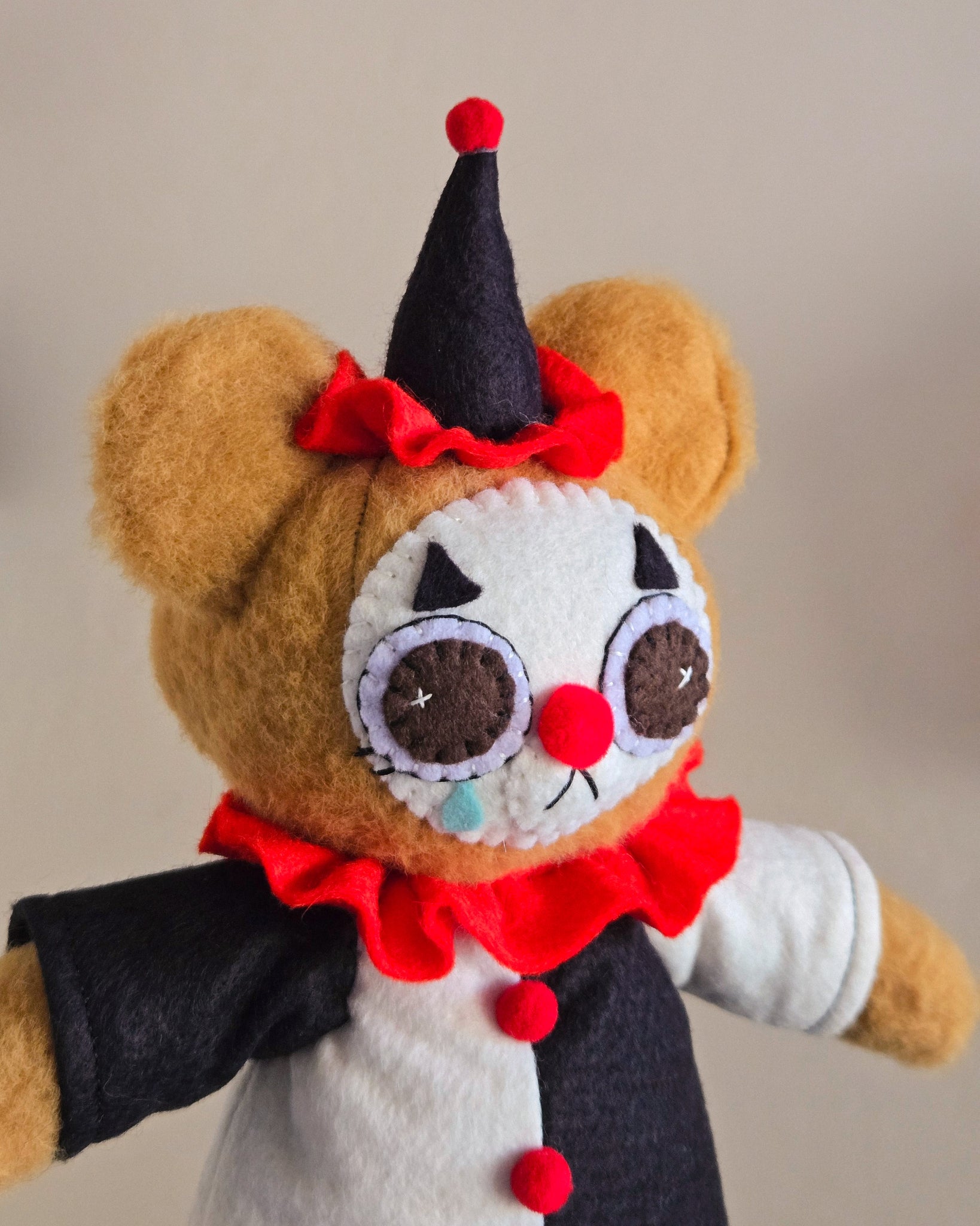 Cute sad clown bear! This bear is dressed up in his best clown outfit. He's wearing a black and white top with black and white gingham pants. He's made out of a soft/fuzzy fabric to add to the cuteness!